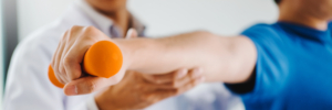 Physiotherapist man giving exercise with dumbbell treatment About Arm and...